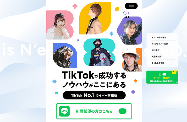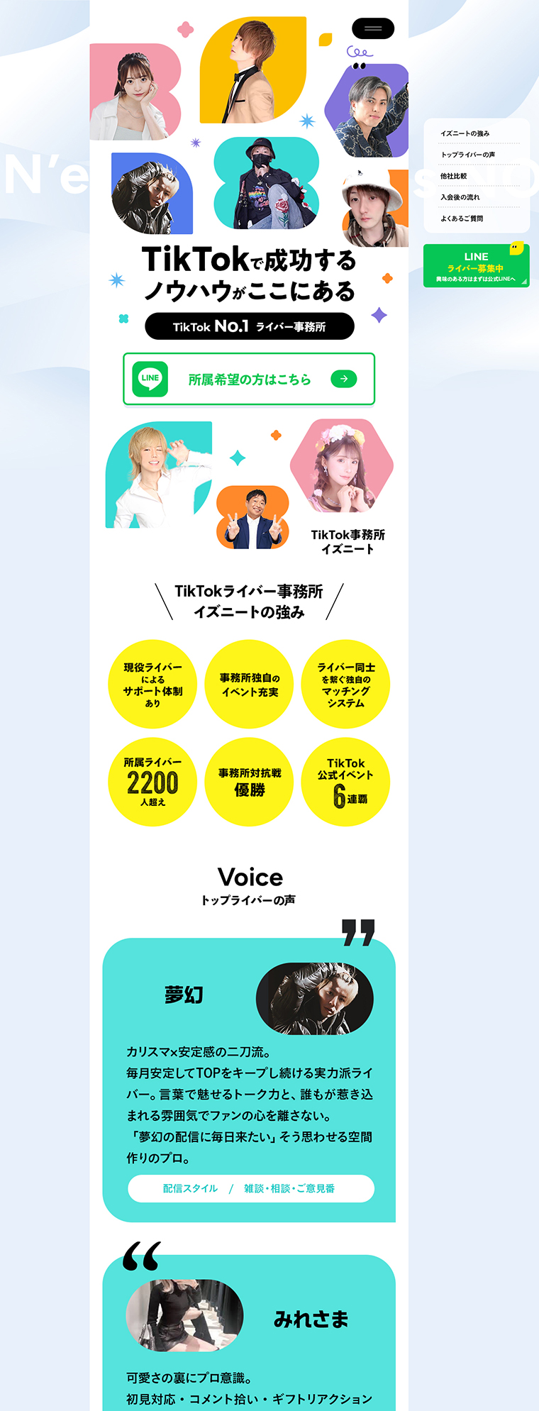 Tiktokライバー事務所最大手、株式会社イズニート様のライバー募集に関するLP制作を担当させて戴きました。