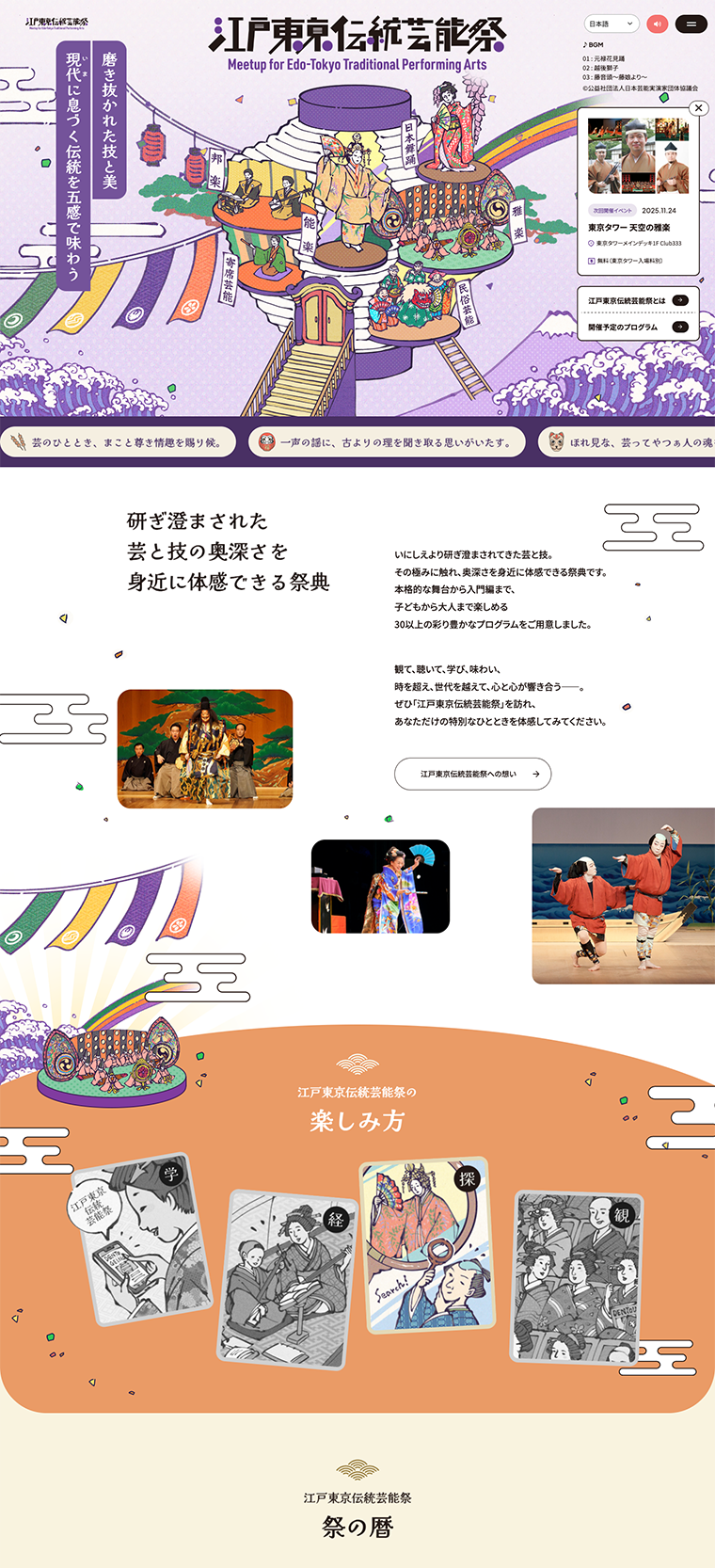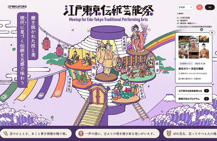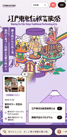 2025年10月にプレイベントを行い早くも大盛況の滑り出しとなっている本イベントのWEBサイト制作を、江戸東京伝統芸能祭実行委員会様よりご依頼をいただき、モノクスが担当させていただきました。
