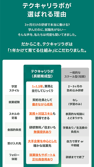 最大の特長は、短期詰め込み型ではなく1年〜1年半という十分な期間をかけてじっくり研修を行うこと。基礎から実践まで段階的に学び、最終的にはエンジニアとして他社へ就職するところまでをゴールとしています。